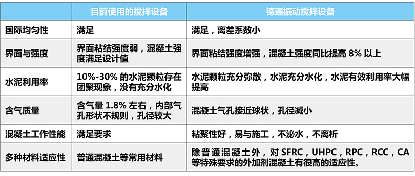 試驗(yàn)數(shù)據(jù)表明:在同等條件下,振動(dòng)攪拌與傳統(tǒng)的強(qiáng)制式攪拌相比,當(dāng)水泥用量不變時(shí),混凝土強(qiáng)度提高8%以上;當(dāng)混凝土強(qiáng)度不變時(shí),大約可節(jié)約水泥5%~25%;攪拌時(shí)間可縮短20%以上,節(jié)能約30%。振動(dòng)攪拌從微觀上改善了混合料的固液氣 3 相結(jié)構(gòu),提高了混凝土性能 。